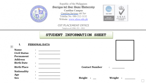 Submitted by admin on Wed, 03/22/2023 - 15:55 OJT forms: AttachmentSize (APPLICATION) OJT ACCEPTANCE FORM.pdf255.47 KB (APPLICATION) STUDENT INFORMATION SHEET.pdf120.92 KB (FEEDBACKING) EVALUATION FORM.pdf282.45 KB (FEEDBACKING) MONTHLY PROGRESS REPORT.pdf244.52 KB (FEEDBACKING) STUDENT INFORMATION SHEET.pdf172.72 KB
